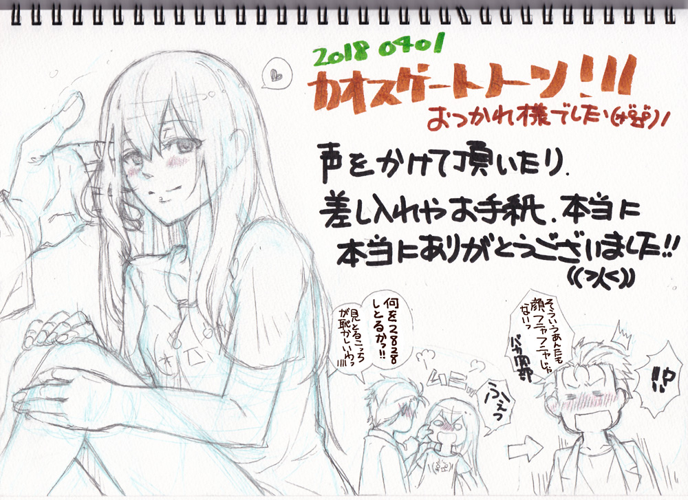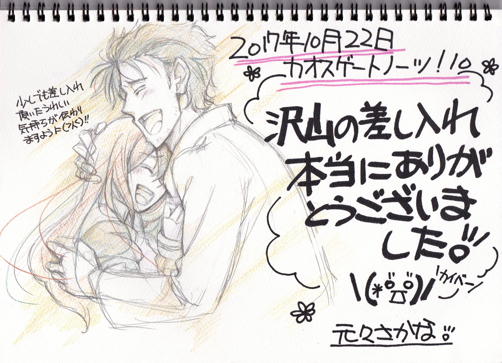 イベント情報 2018/04/03 カオゲノお疲れ様でした(*´ω`*) 日曜日のカオスゲートノーツお疲れ様でした・:*:・(*´∀`*)・:*:・前回と違い良いお天気でしたね!スペースに立ち寄って下さった方々にはありがとうございます!声を掛けて頂いたり、差し入れやお手紙も本当にありがとうございました(>人<) イラストはオカクリ新刊本から。朝起きたら紅莉栖ちゃんはこれくらいふにゃふにゃした顔をしててもいいんじゃないかと思って描いてみました(*'ω'*)今回の新刊は温泉シリーズからうちの本読んで下さってる方への糖分補給…みたいな感じですwあと私が糖分摂取するための本ですっwほら温泉とかメイクイーンの本って気持ちが繋がってるのは分かるけど、ちゅっちゅがない。そう、ちゅっちゅがないっっっ!!!!!これ大事です!なのでオカクリちゅっちゅさせてやるーーっと思ったんですが…エロは原稿密度高すぎで死にそうでした('、3_ヽ)_ っていうか自分が描くなら2人でクスクス笑いながらちゅっちゅし合ってるだけで良かったかも知れない。そんな本、いつか出したい…。とりあえず今回は糖分補給タイムでしたので、次の夏に出す本はまた温泉とかメイクイーンみたいなすれ違って挫けて腐ってみたいな本ですwとりあえずオカリン沢山苛めてこようと思います←紅莉栖×岡部本「xxx9」は…すみません、10分ちょっとで完売でしたね…すいません。男性の方も結構購入されてて、時々「これ紅莉栖×岡部なんですが大丈夫ですか?」と聞いてたんですが、お断りされることがなかった(*´∀`*)男性の方も女性の方も手にして下さって本当にありがとうございました!!読んだ後はどう思ってるか分からないけど…えへへ(汗発行物購入する際に冬のメイクイーン本の感想聞かせて下さったり、色々声かけて下さって本当にありがとうございます。「ファンです」って言ってくださった方…もうね、なんていうか…もうっっ!次も本出しますねっ!!!としか言えず申し訳ないけど。でも声かけて頂けたおかげで次の本も頑張れます。ありがとうございます。本当にありがとうございます(>人<)いつも大体イベントは最後までいるんですが、今回一時半には片付け始めて2時時ごろ撤収させて頂きました。告知もできずすみませんでした。夏に出す予定のオカクリ本の資料を集めたくて早めの撤収となりました。お蔭様でなんとか本描ける位は資料集まった…と思いたいwなので夏の本、楽しみにして頂ければ嬉しいです。60Pで収まってくれ…頼むから…っ新刊の感想もすでに送って下さった方々、本当にありがとうございます(*´Д`*)昨日全身筋肉痛で這い蹲ってたんですが、這い蹲りながら感想見て2828してる気持ち悪い人になってましたwもう感想凄く嬉しいので、送って下さってありがとうございますっ!!頂いた感想はちゃんとお返事させて頂きますので、もう少しお待ちくださいね(´ー`)ノシ次に動くのは夏になります。受かれば夏コミと、あと大阪行きます。スパコミにするかこみトレにするか…まだ決めてないんですが、関西でシュタゲ好きな方いらっしゃれば宜しくお願いします(´∇`)ノシなので、新刊は出す予定なので宜しければまたお付き合いください。それでは、ゼロアニメ直前で死にそうなさかなでした。紅莉栖ちゃんが死んでる世界が始まる絶望と、またアニメでシュタゲ見れる喜びで泣けばいいのか踊ればいいのか…っっっ!くぅっ!!!