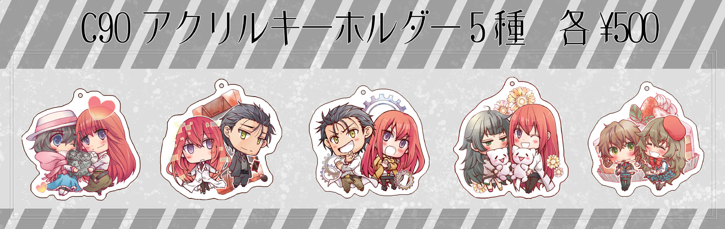 イベント情報 2016/08/09 【C90】アクリルキーホルダー お久しぶりです。告知がギリギリですみません(><)夏コミでシュタゲのアクリルキーホルダー出します。 サイズ:7cm×7cm価格:1つ500円王道定番な鳳凰院夫婦(*´∀`*) ゼロリンとアマデウス紅莉栖(`・ω・´) ほのぼの真帆&紅莉栖(*´ω`*) ほんわかかがり&まゆしぃ☆親子 大好きなショートケーキで由季&鈴羽親子 以上の5種類になりますー!最初2種類くらいだったんですが、印刷所さんがプラス料金で絵柄追加できるというので。気がついたらあれも描きたいこれも描きたいで…気がつけば5種類w金具はナスカンになります。ボールチェーンと選べたのですが、私がボールチェーンいつも外れちゃうので。7×7cmで大きめなので重たいかもと思って丈夫そうなほうにしました。当日はカゴの中にアクキーの在庫を入れて、みなさんが手に取りやすいようにディスプレイする予定なので。気に入った子がいれば宜しくお願いします(*´ω`*)こちらはpixivの告知ぺージになります。【C90】アクリルキーホルダー by 元々さかな on pixiv明日は新刊のご案内に来ます。毎日順番にお知らせして、金曜日におしながきうpして最後になる予定です。数日の間、宜しければお付き合い下さい。それでは明日更新に来ますね
