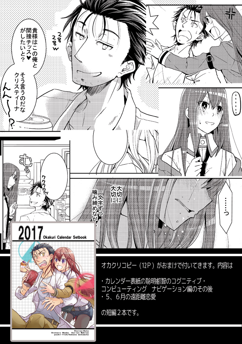イベント情報 2016/12/29 2017オカクリカレンダー+オカクリミニ本 冬コミで出すオカクリしかいないカレンダーですw・卓上リング綴じCDサイズ7枚綴り・12Pオカクリコピー本以上セットで500円になります。 一部ですがちょっと飾りにくそうなイラストが混じってます( ;´∀`)ですのでその場合はイラスト集とオカクリ本ということで宜しくお願いします。7,8月辺りが怪しいです…はい、すいません(土下座冬コミの発行物のお知らせは以上になります。後は深夜にお品書きアップしに来ますので、それで冬コミ告知は最後です。本当にギリギリになってしまって申し訳ないです、宜しくお願いします(><)