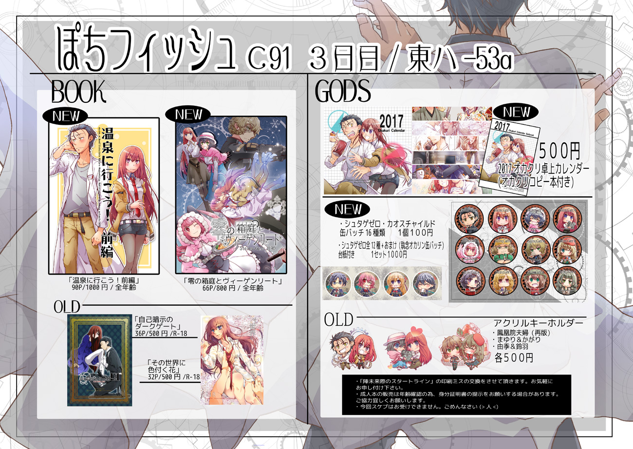 イベント情報 2017/08/11 コミケ告知 告知がまったく来れてない状態で申し訳ありません(>人<)現在本人まだ新刊2冊目執筆中です(大汗明日にまとめて告知来ますので少々お待ち下さいっ。こちら簡単なメモですが、新作の目安にして頂ければ。【新刊】 温泉に行こう!後編 106P 1200円 想望断片のバースディゲート(鈴羽生誕本) 無料配布 新刊もう1冊???【グッズ】 クロト様&地獄メイドアクキー2種類 各500円 おっぱいミニマウスパッドストラップ 助手・まゆり 各600円では作業戻ります!まっ、間に合ってっ・゚・(ノД`)・゚・ PR