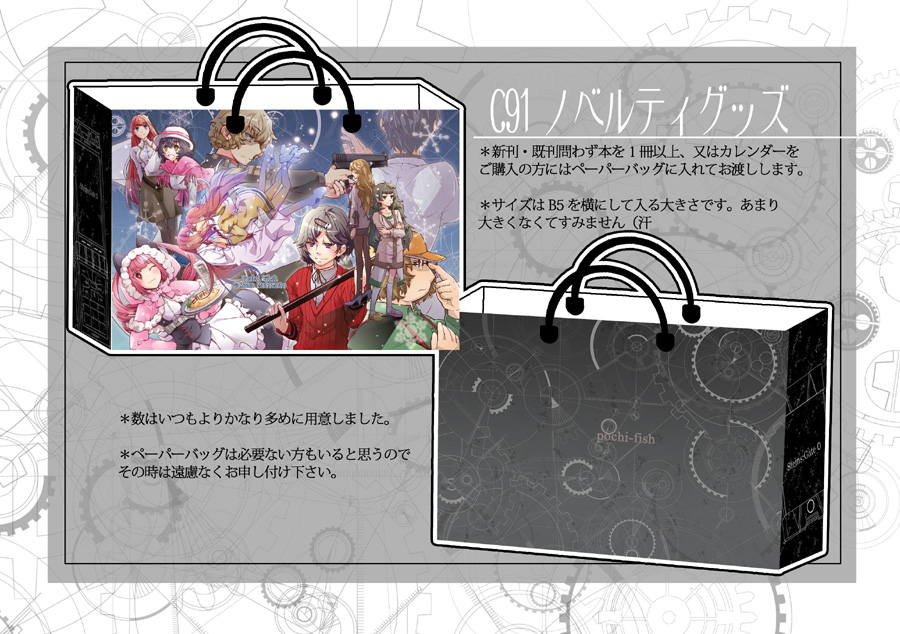 イベント情報 2016/12/30 冬コミお品書き+ノベルティ こんばんは、やっぱり前日になっちゃいましたね( ;´∀`)これが最後の冬コミの告知です。今回色々多くて何度もすみませんでした。 文字が小さくて見にくいと思うので、画像クリックしていただくと大きいサイズで見れます。今回ノベルティがペーパーバッグです。頑張りました、主に予算的にw前回夏コミで製本で大変お待たせしたり、オンリー欠席したりでご迷惑おかけしたので何かお返しがしたかったので作ってみました。でもペーパーバッグって持ってると邪魔だとか帰りに困るとかあると思うので、必要ない方は遠慮せずに言ってください。当日は暖かい服装でお越し下さい。私ももこもこに着てスペースでお待ちしてます。お時間があればのぞいて下さいね。それでは何度も告知に付き合って下さったり、拍手押してくださったりありがとうございました!拍手ちゃんと毎回チェックしております、本当にありがとうございます(>人<)それでは31日冬コミでお会いしましょう(*´∀`*)ノシ