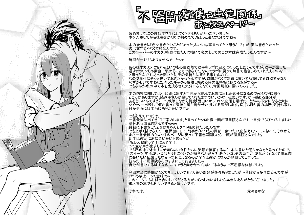 未選択 2018/01/15 「不器用で難儀な主従関係」あとがき 遅くなりましたが冬コミ新刊「不器用で難儀な主従関係」のあとがきペーパーの掲載になります。入稿まで時間無さ過ぎて後書き書けなかったので。入稿後ペーパー作って新刊に挟んでコミケでは配布したんですが、書店委託分には挟めなかったのでブログに掲載しておきますね。今見ると絵が「ああ、凄い焦ってるし疲れてるんだな…」と分かる感じで恥ずかしいんですが(;∀;)まぁ…何というか。リアル感のあるエッセンスだと思っていただければw前向きに考えないと私がうpする勇気無くしそうなのでorzまだ本を読んでない方もいらっしゃるのでリンクを貼っておきます。新刊楽しんで頂けて興味がありましたら読んでやってください(*´∀`*)あとがきペーパーリンク http://blog.cnobi.jp/v1/blog/user/3fb2ff075b8cf212a9bda6ac1833025d/1516016325 新刊の方は手持ち在庫も完売して、書店委託分もあと少し残ってるだけになりました。沢山の方に読んで頂けてとても嬉しいです、ありがとうございます(*´∀`*)でも書店さんの分、入荷一週間で通販分終わってしまったりで。皆さんからすると期間短かったりするのかなぁ…とも思ったり。私が通販利用するとき「わーっ、時間空いたら申し込もう!」と思いつつ一週間経ってる事が結構多いのでw期間短くないかなぁ…買いにくくないかな~とちょっと思ったので。ご意見があれば、お願いする数をもうちょっと考えようかな?と思います。それではいつも拍手押して頂き、ありがとうございます!コメントのお返事させて頂きましたので「拍手コメのお返事」をクリックしてどうぞ。 拍手コメのお返事 PR