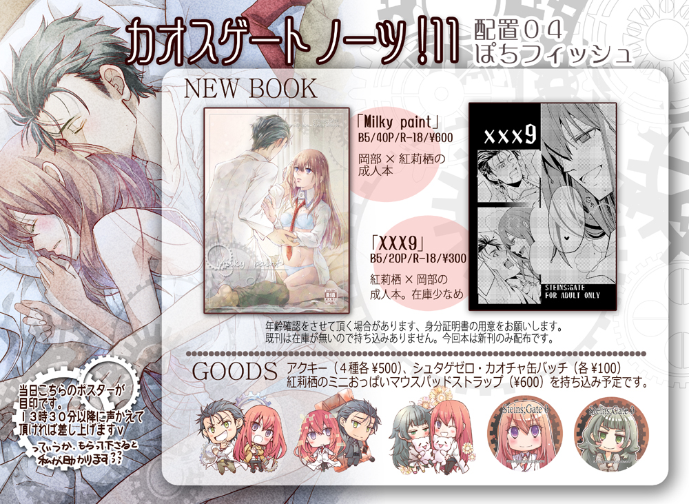 イベント情報 2018/03/31 カオスゲートノーツ!11 お品書きと新刊案内 お待たせしました~!前日の夜で申し訳ありません!2日貫徹してなんとか今朝入稿できました。頑張った…もう、そりゃぁもう…っ(;∀;) こちらができたてホヤホヤおしながきになりますw今回新刊が全部成人本なので必要な場合は年齢確認させて頂きますので、身分証明書の用意をお願いします(>人<)新刊①「Milky paint」B5・40P・成人本・¥600 書店委託 とらのあな様http://www.toranoana.jp/mailorder/article/04/0030/62/51/040030625145.html成人本なので本文サンプルはpixivでお願いします。18歳以下の方は観覧しないで下さい。【新刊サンプル①】Milky paint by 元々さかな on pixiv今回は久しぶりに帰国した助手が寂しくて、ずっとほしかったオカリンのかけられて感じちゃう話です。なんかこういう説明するとHENTAIみたいですがw多分読むとただのバカップルいちゃこらえっちです( ;・∀・)ずっとオカリンといちゃこらしたかった助手と、そんなにも自分に気を向けてくれてる助手が可愛くて仕方ない岡部さんの本です。それと…ですね。多分…多分…なんですが、ちょっと表紙の入稿間違えてしまって。デザインにちょっと違うものが混ざってるかも…しれません(汗明日イベントで箱開けるのちょっと怖い。うふふふふ(白目皆さんイベントや通販で本を手にして気が付いたら疲れてたんだなってふふって笑ってやって下さい…。新刊②「XXX9」 B5・20P・成人向け・¥300 この本は紅莉栖×岡部です。この本は紅莉栖×岡部です!お間違えのないようにお願いします(>人<)こちらも成人本なので本文サンプルの確認はpixivでお願いします。ストーリーもちょっとここでは言いにくいので、こちらもリンク先で読んで下さい。18歳以下の方は観覧禁止です。【新刊サンプル②】xxx9【紅莉栖×岡部】 by 元々さかな on pixiv苦手な方いるかもと表紙は一部分にしたのにpixivのリンクで全画面出ちゃう…。こちらは部数少なめです、いつもオンリーで用意するオカクリコピー本より少し少ない位かな?オンリーのコピー本が大体15~30分位なので、もし手にしてくださる方がいらっしゃれば目安にして頂ければ。でもクリオカなので全然売れない可能性もあるので、最後まで残ってるかもしれませんがwとりあえず部数は私の羞恥と格闘したギリギリの部数なのでこれで許して下さい。通販も大分悩んだんですが、やっぱり恥ずかしくてできませんでした。表紙が本当はカラーだったんですが、直前にチェックしたらちょと印刷できるものではなかったので急遽作った表紙になってしまいました( ;・∀・)なんかオカリンがね。オカリンがエロい顔してる顔しかなくてね、助手多めな表紙になっちゃいました。オカ受け本だからオカリンが表紙にいる方がいいとは思ったんですが、探しても探してもまともな(?)顔がなくてwちょっと突貫工事気味な本ですが宜しくお願いします。それと今回もうギリギリすぎておまけ的なもの何も作れなくてすみません。本買って下さったり、声や差し入れ頂いたり。皆さんから沢山色々なもの頂いてて、私なりに何かお返しができればと毎回作ってたんですが。今回何も用意できなくて…。無理かもしれないけど出発までと4時間、何か足掻きたい気もする。ぐぬぬぬっ。それでは明日スペースでお待ちしてます(*'ω'*)楽しいイベントさんかになると良いですね。皆さんも気をつけて会場までお越しくださいね。それでは。