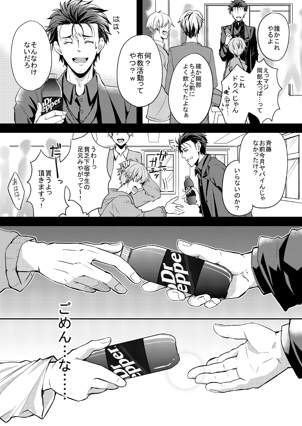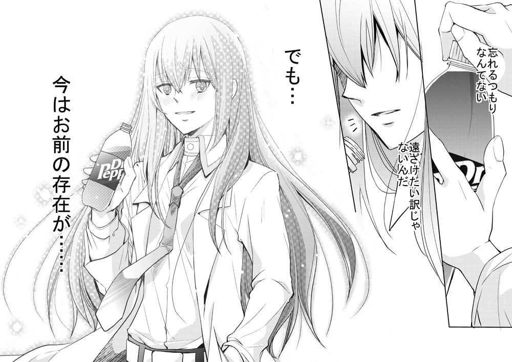 Steins;Gate0 2018/04/16 【ゼロ漫画】ゼロリンとドクペ まだ黒服着始めた位のゼロリンです。オカクリなのでちょっと暗めです、すみません。大学構内になります。それだけオカリンにとって大切だったっていうお話。見にくい場合はクリックすると画像が大きく表示されます。 ゼロリンとドクペ by 元々さかな on pixiv2年位前にネーム切って、描こうかどうしようかずっと悩んでいた漫画です。シュタゲは本編に辛い場面が多いので、うちの二次創作は明るい気持ちで読み終わってもらって。本編でちょっと疲れた心を休めて、またシュタゲ楽しんで貰いたいな…と思ってる部分があるので。暗いシリアスのお話は全部ネームしまってあるんですが、これはゼロアニメへの不安から我慢できず描いてしまいました。アニメはまだ1話しか放送されていないので分かりませんが、ゲームのゼロリンはドクペの話は出しても飲んでいなかったので。こんな気持ちなのかな?という妄想漫画です。いつもと違って幸せな形での表現ではありませんが、ゼロリンの紅莉栖ちゃんを思う気持ちの大きさを描ければいいな…と思いました。ちなみに、紅莉栖ちゃん口開けてますが。台詞は「馬鹿ね、あんたはそんな事気にしなくていいのよ…」です。反転しておきましたので、興味のある方だけどうぞ。いつも紅莉栖ちゃんが好きで可愛くてたまらなくて、でもヘタレで上手く伝えることも態度で示すこともできない…というオカリンがいるオカクリ描いてますが、ゼロになっても紅莉栖ちゃんが大切で愛おしくてどうしようもないオカリンになっちゃうみたいです。でもだからこそ自分が許せない…みたいな。アニメが始まって刺激されて。またゼロ描いちゃうかもしれませんが、やっぱりゼロでもオカクリが好きで堪らないので。また湿っぽい漫画描いてしまったら、大丈夫だよって方はお付き合い頂ければ嬉しいです。お話が暗くなってもオカリンが紅莉栖ちゃんのこと全身で愛してるっていう部分はぶれないで行くつもりです。ゼロはツライですね。もう本当にアニメ見てどれほど泣いた事かwあとアニメは22話、半年頑張ってゼロ応援していこうと思います。拍手沢山ありがとうございました!コメントもありがとうございます!「拍手コメのお返事」をクリックして読んでやって下さい。 拍手コメのお返事