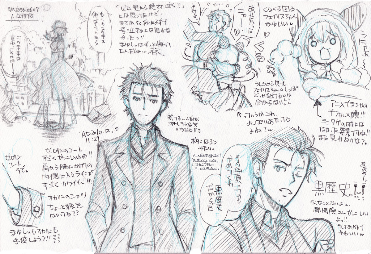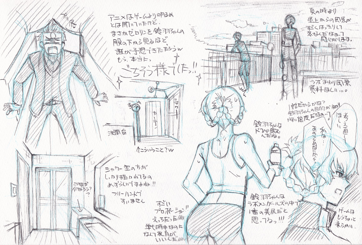 ゼロアニメ感想落書き 2018/04/18 【ゼロアニメ感想落書き】1話 ゼロアニメ1話「零化領域のミッシングリンク」の感想落書きです。自分用のメモにしてる部分もあります、すみません。スケッチブックにシャーペンでガサガサ描いたものなので、所々見にくかもしれません。それと感想は私の個人的なものなので、皆さんと食い違う部分もあるかも知れません。その点はご理解頂けると嬉しいです。1話のネタばれだらけなのでご注意下さい。見にくい場合はクリックすると画像大きく表示されます。 もう今晩2話ですね。せめて2話の前にはアップしたい!と思ったら時間がなくて、指圧師とか先輩のスリッパとか描けませんでした~!先輩のスリッパちゃんと出てきた時は心の中でガッツポーズしましたw最初は「左右違うとかそんな馬鹿なっw」と思ったんですが、今は先輩のチャームポイントに見えます(*´Д`*)これから半年。全話感想落書き描くのは難しいと思いますが、私の脳内整理のためにも描けるだけは描いてみたいなぁ…と思います。まぁ、今回みたいにスケッチブックに落書きガザガザ描いただけの状態だと思いますが( ;´∀`)気が向いたらお付き合い頂ければ嬉しいです。1話では紅莉栖ちゃんが何者なのか、オカリンとどんな関係でオカリンは彼女のことをどう思っているか。その辺が影に隠した描写になってましたね。これからこの2人の関係、オカリンの気持ちがどんな風に描かれていくのかとても興味深いです。同時に出てくるたびに私は泣き崩れそうですw実は先週、1話は放送前から泣いてましたw晩御飯の支度してたんですが、すでにこの時から涙が止まらなくて。メソメソしながら豚汁作ってました( ;´∀`)そしてメソメソしすぎて副菜の冷奴用意しようとして豆腐一丁丸ごとシンクにぶちまけて粉砕しました。もったいない…ごめんなさいoraなので昨日の時点でシチュー2日分仕込んでおきました!これで抜かりはありません、心置きなく(?)不安でゴロゴロしてようと思いますwこれから半年、毎週こんな不安なのか楽しみなのか分からない気持ちと向き合いあうのかと思うと「長いな」っと思うんですが。夏コミの頃には最後に向かってゼロは走ってるのかな?と思うと「短いな」とも感じます。ゼロアニメはゲームと違う結末だと聞いてるので、ゲームプレイ済みの方はきっと「この台詞がでてきたって事はこっち方面かっ!」とか「これがこのイメージならこっちの要素が?!」とかワクワクドキドキしながら推理しながら見ていくのかな?と思うと1つ1つ目が離せないなっと思います。個人的にですが。ゼロは辛い場面が多いですが、それでも尊く思ったり辛いけど目が離せなかったりするのは「この先にはシュタインズゲート線が待っているから」という希望があるからだと思います。紅莉栖ちゃんが助かることはとても重要ですが、それだけではなくラボメンや天王寺親子。みんなが笑える世界。そこにたどり着く為の大切な過程がゼロなので。できればアニメはシュタインズゲート線へと続く希望が見える終わり方だと最高に嬉しいな…と思ってます。そして今夜2話では恐らく!OP&ED来るんじゃないでしょうか?!・:*:・(*´∀`*)・:*:・ファティマもLAST GAMEもすっごくかっこ良かったので、視聴してからずっと楽しみにしてました!映像早く見たいですね(*´ω`*)拍手ボタン押して下さった方々、ありがとうございます!ちゃんと見て励みにさせて頂いてますので、気が向いたらまた押してやって下さい。それでは(´∇`)ノシ PR