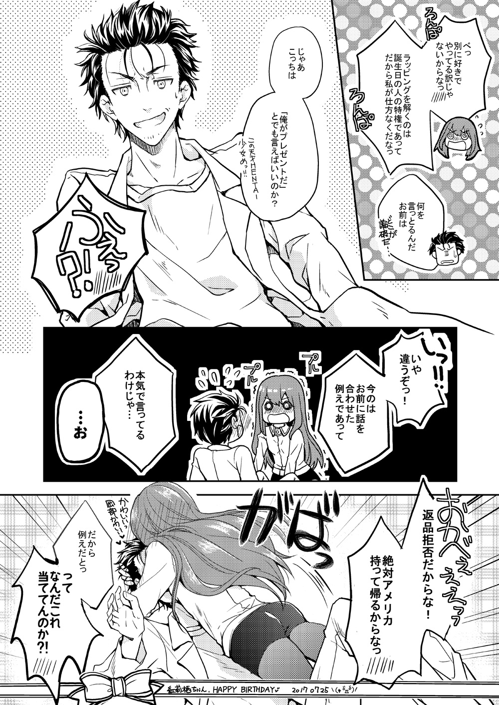 Steins; Gate 2017/08/03 2017年 助手誕 助手のお誕生日漫画、ブログにアップするの忘れてたので今頃ですが載せておきます( ;´∀`) 2017助手誕 by 元々さかな on pixiv遅くなりましたが、紅莉栖ちゃんお誕生日おめでとう(*´Д`)何とかお祝いしたくて夏コミ原稿の合間にちょこちょこ進めたんですが、ツイッターもPIXIVも結局遅刻でしたorz本当に…こんなコミケ準備佳境な時じゃなかったらバケツプリンとか作って、もっと漫画描いてお祝いしたいのに…っ。旦那の岡部さんも冬コミ前なんですよね…この夫婦は変なところで息ぴったりでもうっ…もうっ。゚(゚´Д`゚)゚。お祝いしたいのにできないじゃんかーーっwでも去年何もできなくて、本当に悔しかったので三ヶ月前位からスケジュールとにらめっこして。数日遅刻しましたが何とかかけました。お陰で今コミケ準備笑えない状況ですが…っ。それでは休憩がてらブログも書いたので原稿戻ります。