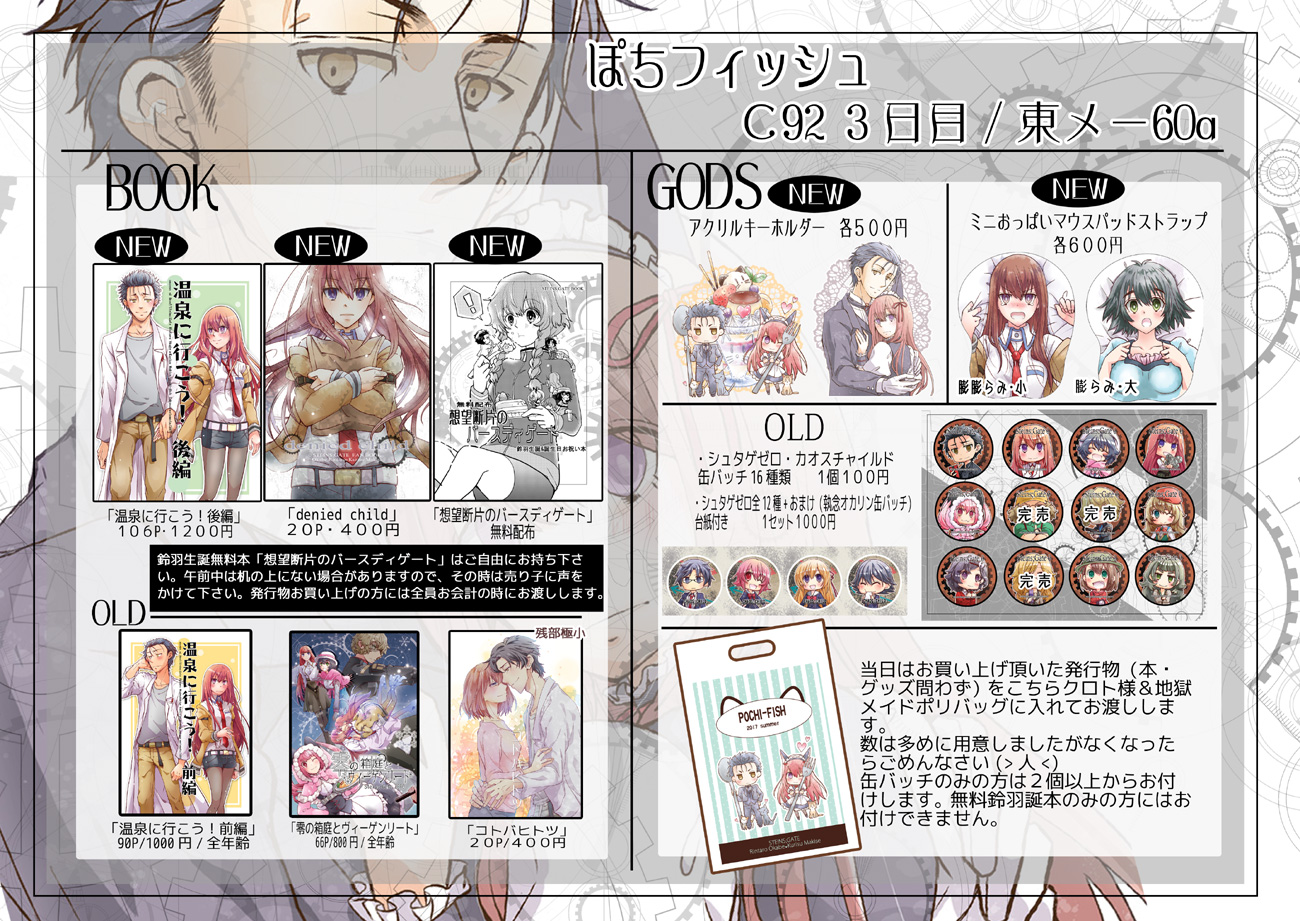 イベント情報 2017/08/11 コミケ告知 告知がまったく来れてない状態で申し訳ありません(>人<)現在本人まだ新刊2冊目執筆中です(大汗明日にまとめて告知来ますので少々お待ち下さいっ。こちら簡単なメモですが、新作の目安にして頂ければ。【新刊】 温泉に行こう!後編 106P 1200円 想望断片のバースディゲート(鈴羽生誕本) 無料配布 新刊もう1冊???【グッズ】 クロト様&地獄メイドアクキー2種類 各500円 おっぱいミニマウスパッドストラップ 助手・まゆり 各600円では作業戻ります!まっ、間に合ってっ・゚・(ノД`)・゚・