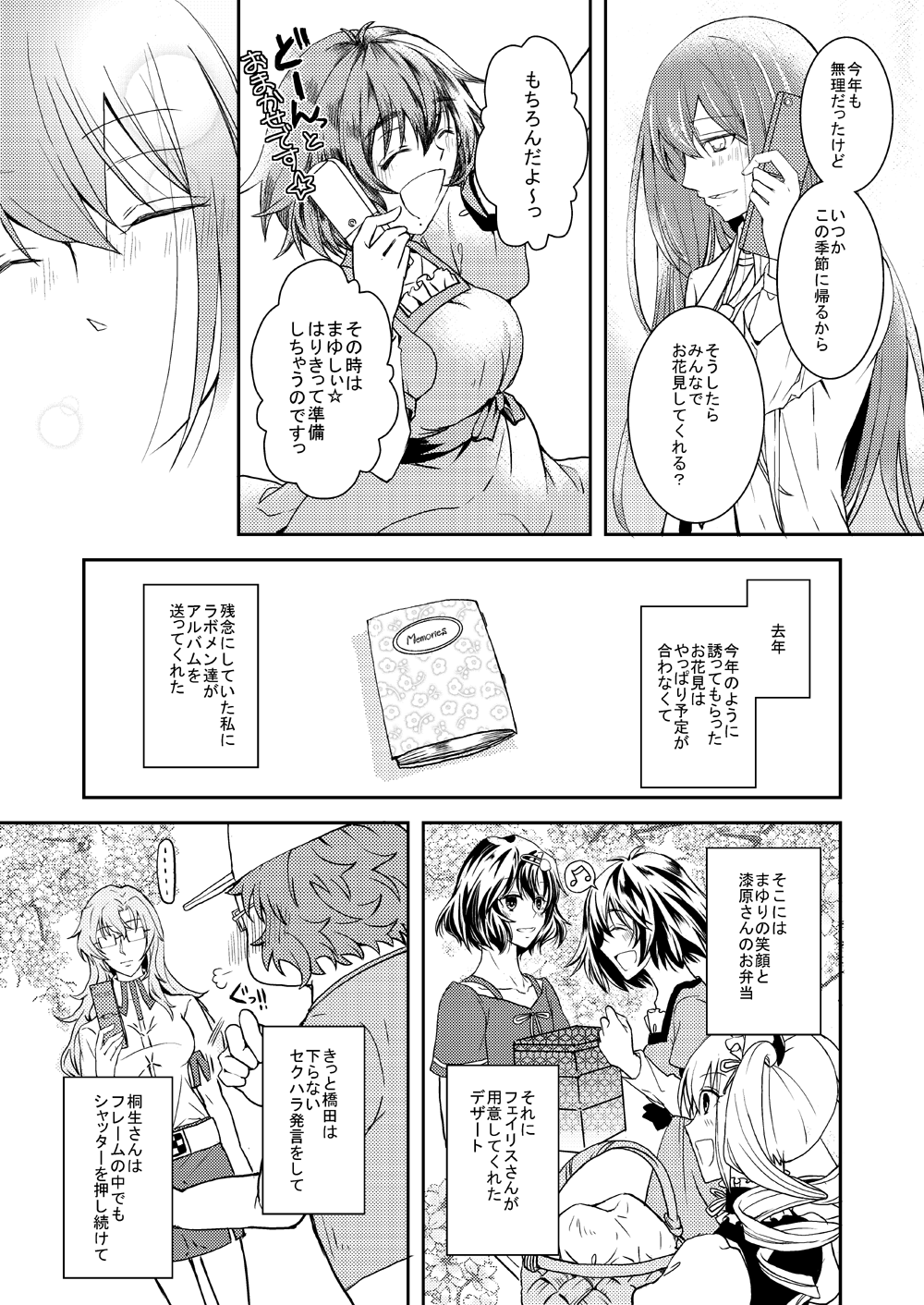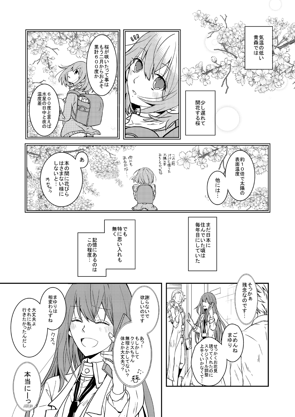 Steins; Gate 2017/04/29 助手と桜の話。 こんにちは、暫く放置気味ですみませんでした(>人<)この漫画描きたくて頭グルグル考えてたら二週間くらいたってるのかな?( ;´∀`)地元の桜散っちゃうし、ニュースで青森の桜が満開だと聞いてひぃぃっ!と慌てて描きましたw読みにくければ画像クリックして頂くと大きく表示できます。 Pixivにもアップしてます。助手と桜の話 by 元々さかな on pixiv紅莉栖ちゃんがオカリンと出会えた事で繋がったもの…と言いますか。ラボメン達と交流して紅莉栖ちゃんの心の風景の変化みたいなものが描きたくてかきました。オカクリ大好きだけど、やっぱりシュタゲが好き!っていうのが前提なので、たまにはこういうのが描きたくなります。でも描くのがすっごく遅いので、ラボメン全員出てくると描いても描いても終らない( ;´∀`)前に冬コミで出した岡部誕本みたいなラボメンわちゃわちゃして少しシリアス混ぜて最後オカクリで締める…みたいなの好きなんですが、時間泥棒すぎるのが難点でwでもやっぱりラボメンみんながいてこそのオカクリ…みたいなのが大好きです。あと私が描くシュタゲ二次創作はほとんどシュタインズゲート線なので鈴羽ちゃんが居ないのが心苦しい。やっと今年ですね、待ってるよ(;∀;)元々ツイッターに掲載するつもりで描きはじめたんですが、そうすると4Pに纏めるがベストになるわけで。最初のまゆりと紅莉栖ちゃんの会話が短縮できなかったり、表現する言葉が見つからなくて描く時間より桜見てボーっと考えて悩んだ時間のほうが長くて。煮詰まると違う漫画描いたり気分転換していたんですが、ブログにまで気が回らなくて放置気味になってしまいました。すみません( ;´д`)ゞカウンターとか拍手ちゃんと見てるので、更新がなくても足を運んで下さった方々には本当にありがとうございます!拍手も本当にありがとうございます!お待たせしてすみませんでした~っ!桜の漫画がなかなか出来なくて合間に描いてた漫画とか。ツイッターには掲載してこちには掲載してないものがちょこっとあるので、また合間見て更新に来ますね(*´∀`*) PR
