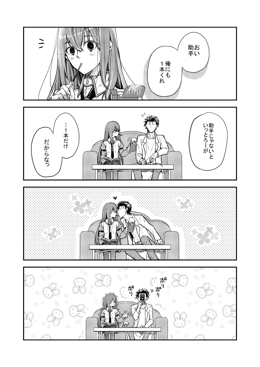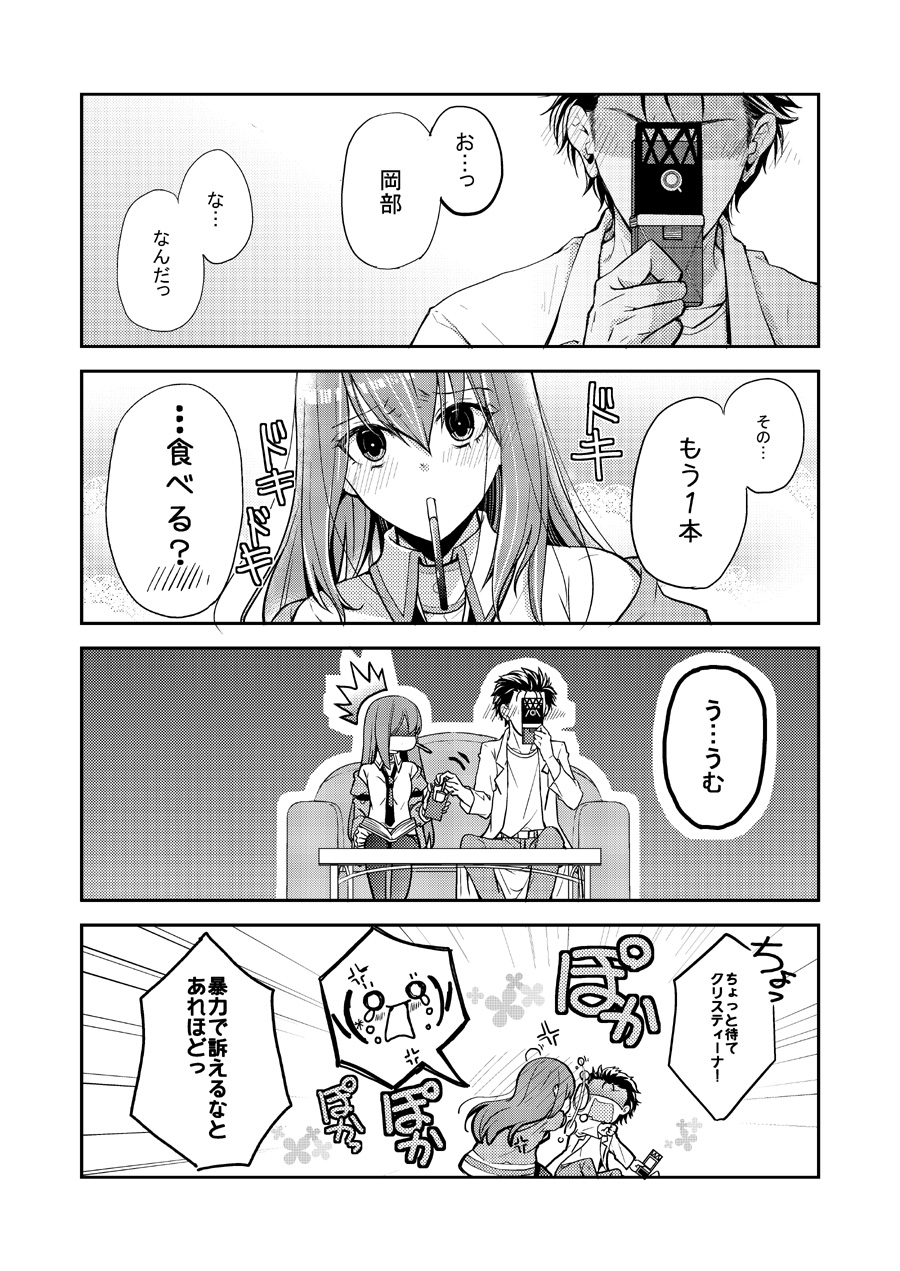 Steins; Gate 2018/01/13 オカクリとポッキー ほんわか日常いちゃこらみたいなオカクリ オカリンが恥ずかしくて携帯で顔隠してるんですが、多分ほぼ隠れてないですw最近のんびり日常なオカクリ描いてなかったので、特に意味も無くありそうなネタですが描いて見ました。ポッキーの日とか全然関係ない日ですが、私が描きたかったのでw後はイベント後の筆ならし的な目的も含めて。イベント終わった直後は何故かペンが滑って上手く線がかけなくなっちゃって…。正確に言うと入稿終わった直後からおかしくなるので、イベントでのスケブの絵は殆ど死んでます(すいません久しぶりに少しまったりした日を暫く過ごせそうなので、1月はちょこちょことweb用の漫画うpできればいいなぁ~と思います。今回みたいな軽~いお話ばかりだと思いますが、見かけたらお付き合い頂ければ嬉しいです(*´∀`*)拍手ボタン押してくださった方々、ありがとうございます。励みにさせて頂いております・:*:・(*´∀`*)・:*:・