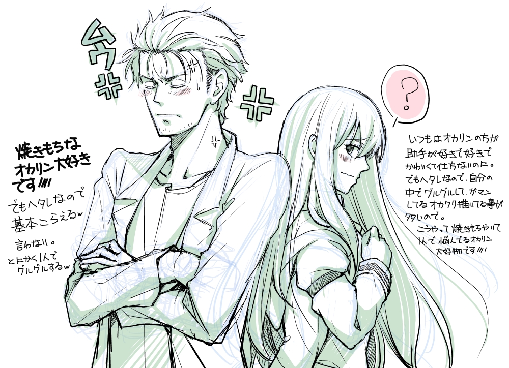 Steins; Gate 2018/04/19 【オカクリ漫画】1人の時に名前呼ぶ練習する助手とか 1人の時にこっそりこんな練習助手がしてたら可愛いなぁって(*´Д`*) 1人の時に名前呼ぶ練習する助手とか by 元々さかな on pixiv1人の時にオカリンの白衣クンカしたり、こっそり鳳凰院ポーズ練習したり(*'ω'*)なんかそういう時の助手って妙に生き生きして、そして乙女で可愛くて。私の好みドストライクなんですが。その延長線上で面と向かっては呼べないけど、名前呼ぶのも憧れてて。こっそり練習してたら凄く可愛いだろうなぁ!と思ってたので描いてみたんですが。ツイッターでは沢山の方に見て頂いて本当にありがとうございました!凄いビックリしましたw実は私、ツイッターがちょっと怖くて( ;・∀・)情けない話ですが…。リプとDMはスマホに通知が来るようにしてるんですが、その他の通知を見ないようにしてまして。だから全然いいねの数とか知らなかったんですが「…なんかフォロワーさんが凄い短時間で増えてる…気が???」と思って恐る恐る久しぶりに通知ページ開いて衝撃で紅茶吹きました。汚いですね、すいません。でも本当にビックリしましたw私が「こんなこと助手がしてたらすっごく可愛いっ」と思ってた助手が、皆さんも同じ気持ちなのかな?と感じれたのは凄く嬉しいです・:*:・(*´∀`*)・:*:・私の漫画が楽しいというより、みんなで「こんな助手かわいいよねっ」「そうだよねっ」と確認し合えた感じができた気がします。ちょっとバタバタしたりゼロアニメ始まったりでブログに投稿するのに時間かかりましたが、そっと置いておきますので気が向いたときに時間つぶしに読んでやって下さい(´∇`)こちらはその時お礼にって描いた落書きオカクリです。いらないかな~と思いましたが一応置いておきます( ;・∀・) 昨日愛知はゼロ2話放送日でしたが、こちらの感想はまた落書きしてうpしに来ようと思います。…といいながら。2話結構衝撃が大きくて、1日経ってもどこを描くべきなのか全然分からなくてwでもどこも尊くて愛おしくて、同時に辛くて。もうちょっとだけ鑑賞しながら描きたい場所決めたいと思います。昨日、拍手押して下さった方々!本当にありがとうございました(*´Д`*)実は結構頑張って感想落書き描いたので、拍手押して下さる方がいらっしゃって嬉しかったです!!また気まぐれにでも押してやって下さい(>人<)それでは。