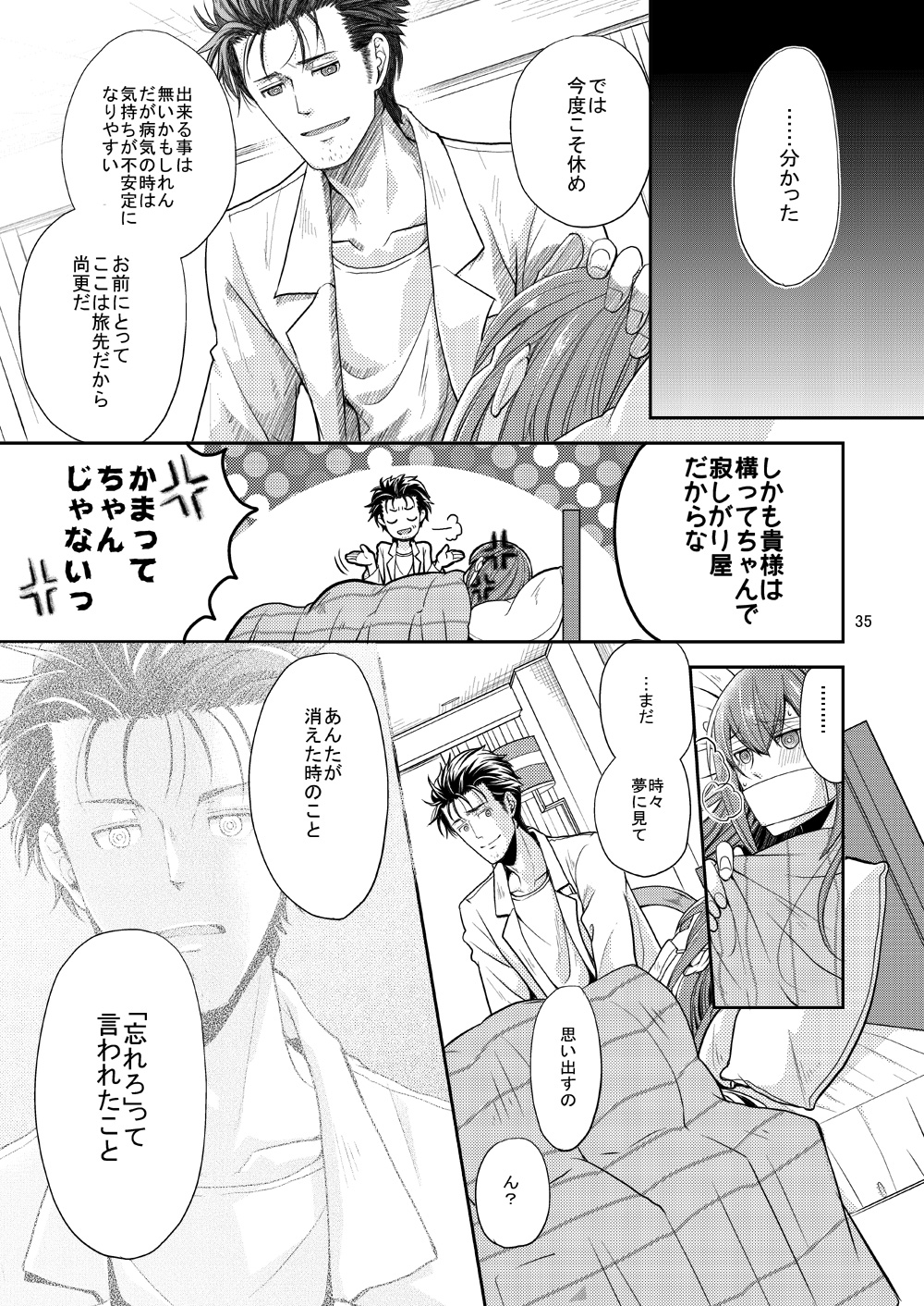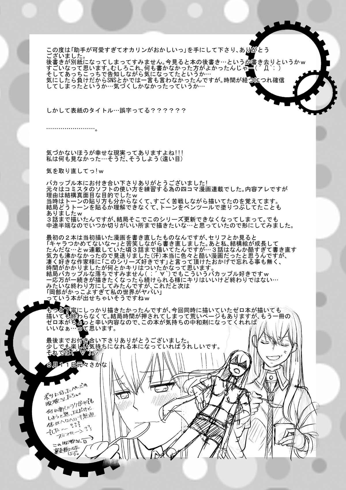 Steins; Gate 2018/09/11 「助手が可愛すぎてオカリンがおかしいっ」あとがき こんばんは。遅くなってすみません、夏コミで発行した「助手が可愛すぎてオカリンがおかしいっ」のあとがきをうpしにきました。忘れてたわけではなく、元々こみトレ終わったらうpしようと思ってたんですが…私一言も「こみトレ後にうpします」って言ってない気がします(大汗)夏コミ前に予約してくださった方とか「こいつ忘れてるな」って思われてもおかしくないですよね、申し訳ありません!!!今更な感じもしますがもし宜しければ読んでやって下さい。確か大したこと書いてなかった気もしますが( ;´∀`)購入されてない方やまだ読まれてない方もいらしゃると思うので、リンク貼っておきます。下の画像クリックして頂くとあとがきに飛びますので宜しくお願いします(´∇`) 「助手が可愛すぎてオカリンがおかしいっ」ですがとらのあな様の通販分が欠品してたので、店舗在庫を移動してもらうように申請しておきました。暫くしたら在庫復活すると思いますので宜しくお願いします。https://ec.toranoana.shop/tora/ec/item/040030659262/「助手が可愛すぎて~」の感想を色々な方から頂きました、ありがとうございます((>人<))それでよく感想で「オカリンが可愛かった」というご意見を頂きまして「あれ可愛いって分類に入るのか∑(゚∀゚ノ)ノ」とちょっとビックリしましたw私が描くオカリンで「可愛い」と言って頂けた事って少ない気がするので、新鮮で…でも嬉しかったです。ありがとうございます(*´∀`*)またこんな「助手が可愛くて可愛くて仕方ない」というオカリンどこかで描きたいですね。助手が好きで仕方ないオカリン描くと精神的に安心するというか、なんか落ち着くので(*´∀`*)例えばお酒で酔ってイケメン笑顔で「お前は可愛いな」とか言い出しちゃう岡部さんとかw確かオカクリの温泉本の時酔ったオカリンがそんな感じだったんですよね。私が酔ったオカリン描くとあんな感じになるんでしょうね。いつか…いつか、片方だけ酔っ払って素面な方が振り回されるオカクリを2本編成とかで本にしてみたい////(希望今回かなり時間がなくて楽しんで描く余裕がちょっとなかったので。少し私の中で浄化不良気味なので、また助手にメロメロなオカリンじっくり描きたいです(*´ω`*)話は変わりますが、明日の深夜にはゼロ21話初回放送ですね!!予告見てどんどんオカリンの表情が生気を感じれるようになってきて、それを見れるだけで涙が出てきてしまって(´;ω;`)もう楽しみで楽しみで仕方ないんですが……21話見るとゼロアニメ放送は残り2話となってしまいますorzそう思うと「水曜日来ないで~っ」と思ったり「でも21話めっちゃくちゃ見たい!!気になるっ!!放送時間はよっ」っという気持ちが渦巻いてます。でもこれって製作して下さった方々が素敵なアニメに仕上げて下さったから毎週楽しみにできたんだろうなって。この長い気がしてたのに短かった半年ですが、その半年放送の為に何年もかけて下さったおかげだよな…と思うと。「長い間ありがとうございました、お疲れ様でした」と最終回を見届けるべきだろうな…って気がしています。…とは思いつつ。最終後は24話が入った円盤を楽しみにするとしても、その後何を支えに生活すればいいんだーーっ!と大変不安ですwとりあえず明日楽しみにして、今は自分の原稿に集中して…現実逃避しようと思います( ;^o^)思わずあとがきじゃなくてゼロアニメの話になっちゃいましたね、すみません。拍手いつも押してく下さりありがとうございます((>人<))拍手のお返事させて頂きましたので送って下さった方は「拍手コメのお返事」クリックしてやって下さい。それでは。 拍手コメのお返事