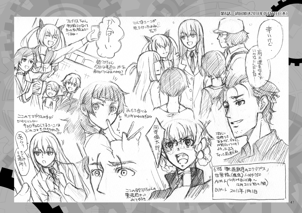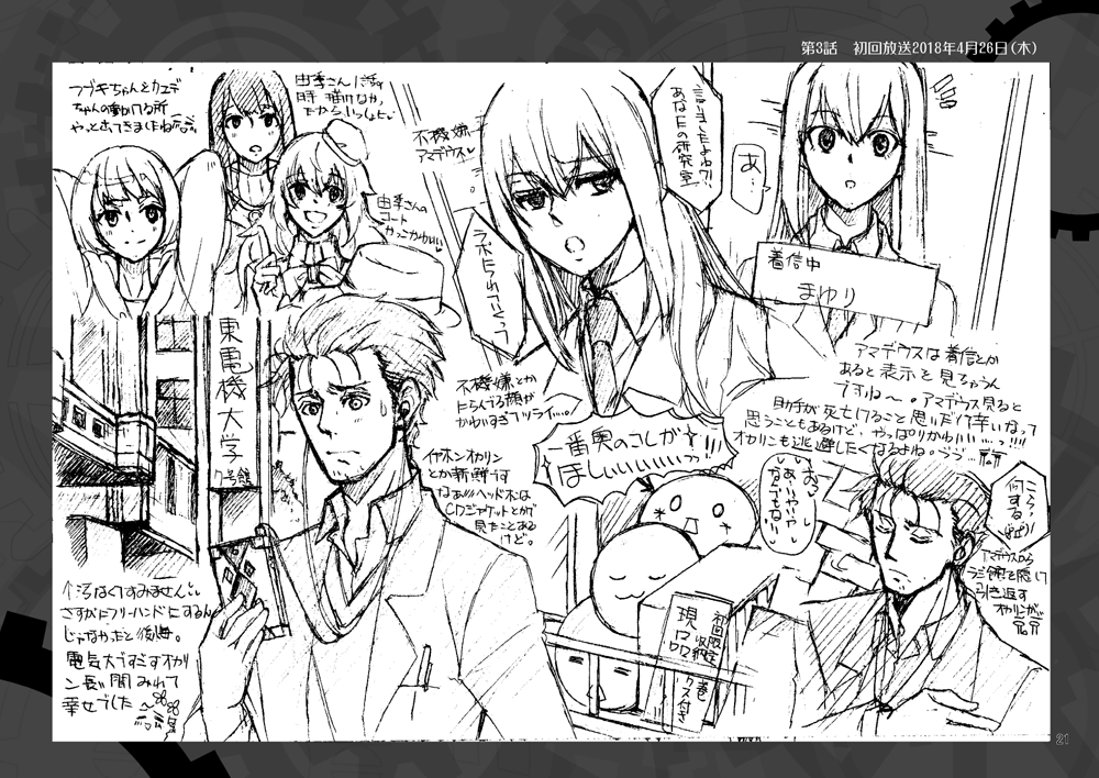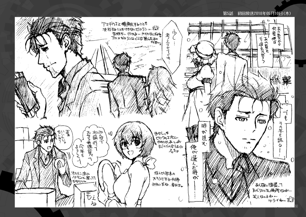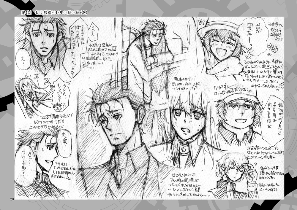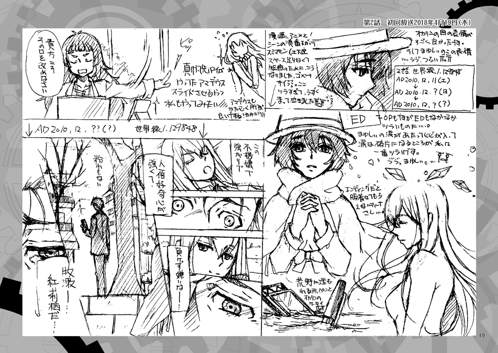 Steins; Gate 2018/12/30 【C95新刊サンプル②】ZERO MEMORIES・上 コミケ新刊2冊目のご案内です。焦ってるのでコミケ告知の文章が結構簡潔になってるかもしれませんがすみません(;゚;Д;゚;)あと記事の更新2件あるのでとにかく更新できるように頑張りますっ「 ZERO MEMORIES・上」B5横綴じ・70P・700円書店委託とらのあな様https://ec.toranoana.jp/tora_r/ec/item/040030693371/シュタゲゼロアニメの1~9話の落書きまとめ本です。 ツイッターとブログにちまちまうpしていた落書きですが、ご要望があったので本にまとめました。残り10~23話は次のイベントにまとめて発行する予定です。私がゼロアニメ理解できる様に…と思った個人的な落書きなので、印刷終わった今でも「これ販売していいんじゃろか?(;゚;Д;゚;)」と不安な本ですwブログとかで見たことがある方はご存知かと思うんですが、私にとって大切な部分をメモしてる落書きなので。正直他の方から見たらどうでもいい情報がちらほらと(汗)。オカリンの朝食とかホントどうでもいいと思う。いや、私にとってはテンション爆上がりだったんだけど!w普通にアニメ楽しんでる方には凄くどうでもいい(白目)漬物の中にナスあったとか凄くどうでもいい。私は死ぬほど萌えて転がってたけど。なので好きな方だけ手にして下さいwお値段も下げれるだけは下げたつもりです。元々A5単色表紙で本文オンデマンド印刷の予定だったので、それに近い価格には頑張りました。実際には表紙・本文共にオフ印刷なので、その辺はお得に感じて頂ければw部数も最近の本の半分くらいにしてあります。書店委託分も今の予約で3分の1位入ってたと思うので欲しい方いらっしゃれば宜しくお願いします(*´∀`*)でも9話で70Pだったので残り13話分のページが怖いですね( ;^ω^)