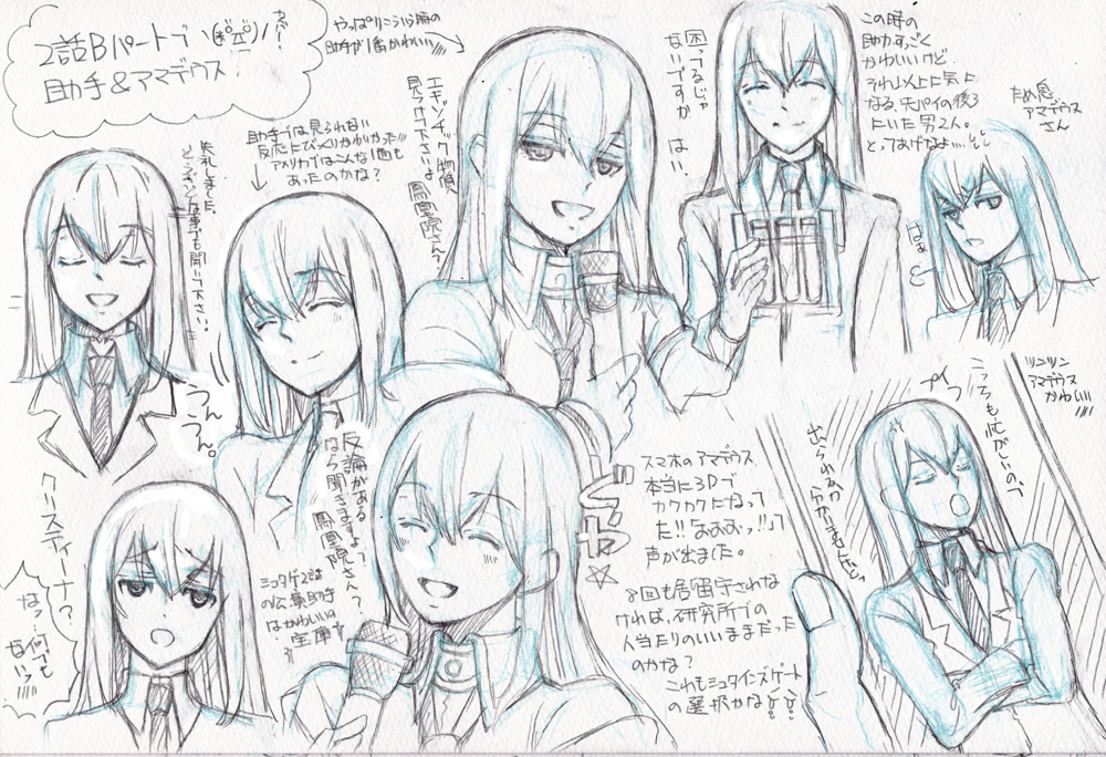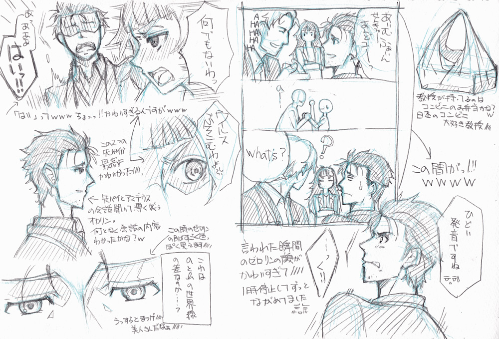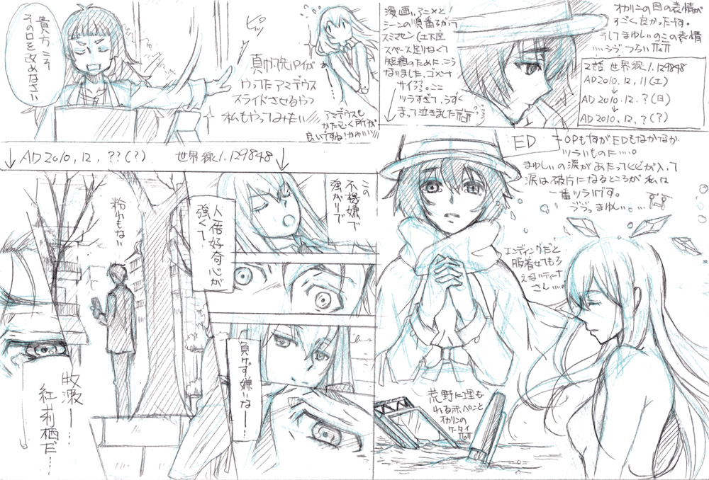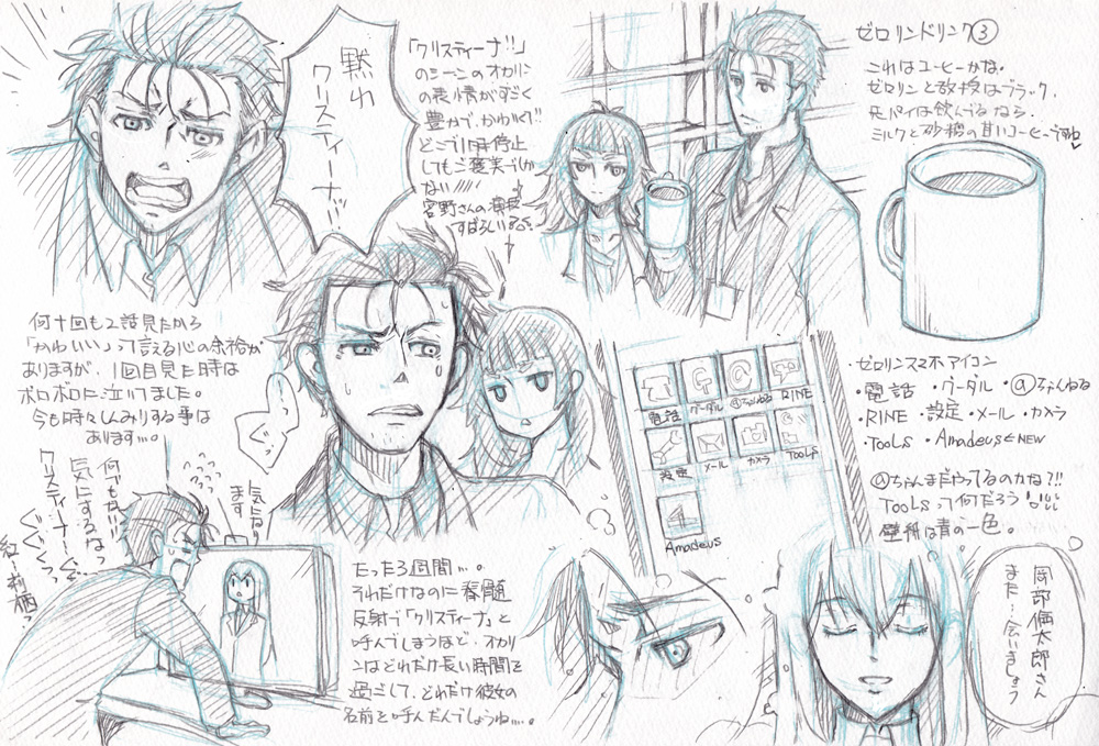 ゼロアニメ感想落書き 2018/04/25 【ゼロアニメ感想落書き】2話とOP・ED こんばんは(*´д`*)ゼロ3話数時間後になってしまいましたが、2話の感想落書きです。ゴチャゴチャ描いてあるので時間のある時にでも暇つぶしに読んでやって下さい。読みにくい場合は絵をクリックすると大きく表示されます。OPオカクリの部分で涙が止まりませんでした。゚(゚´Д`゚)゚。1話い続いて冒頭ですでにボロ泣きですw Aパート Aパートの最後でトラウマな「はじめまして」が来て、またもやここで泣き崩れ。泣いてばっかりですねwこういうの聞くと本当にもう紅莉栖ちゃんはいないんだって感じて。どうしても涙が堪え切れません。あとゼロリンのハンカチにビックリしました!wスッと差し出す姿が凄く紳士でドキドキしました//////Bパートやっとアマデウスが出てきて助手もちらちら出てきたので、1枚目は助手祭りですw PV告知見てからオカリンの涙がずっと気になってたんですが、最後の部分でした。礼儀正しく接してくれたアマデウスより不機嫌でツンツンしたアマデウスを見て「牧瀬紅莉栖だ」と感じてるオカリンを見ると、オカリンはあの三週間の間に助手と接して行くことで惹かれて好きになったんだな…って感じて。もううずくまって泣いてました…。緊張と泣きすぎで2話約30分見る間に唇バリバリに割れて、入稿直後レベルの肩こりになってましたw寝ようと思っても肩こり痛すぎて眠れない( ;´∀`)2話は衝撃が強くて、でもこれだけ展開が速いのに上手く纏めて下さってて。目が全然離せなくて、結局朝の五時までマラソンしてしましました( ;・∀・)放送直後に10回以上見るとか…こんなの久しぶりですw今夜は3話放送ですね(*´∀`*)PV告知見る限り少しは心穏やかに見れそう…な気がしてます。1,2話みたいに泣き崩れることはないんじゃないかと。多分wあと2時間半ほどで放送です、観測楽しみですね!拍手押して下さった方々、ありがとうございます((>人<))ちゃんとブログ見てくださってる方がいらっしゃるんだなぁって実感できて嬉しいです! PR
